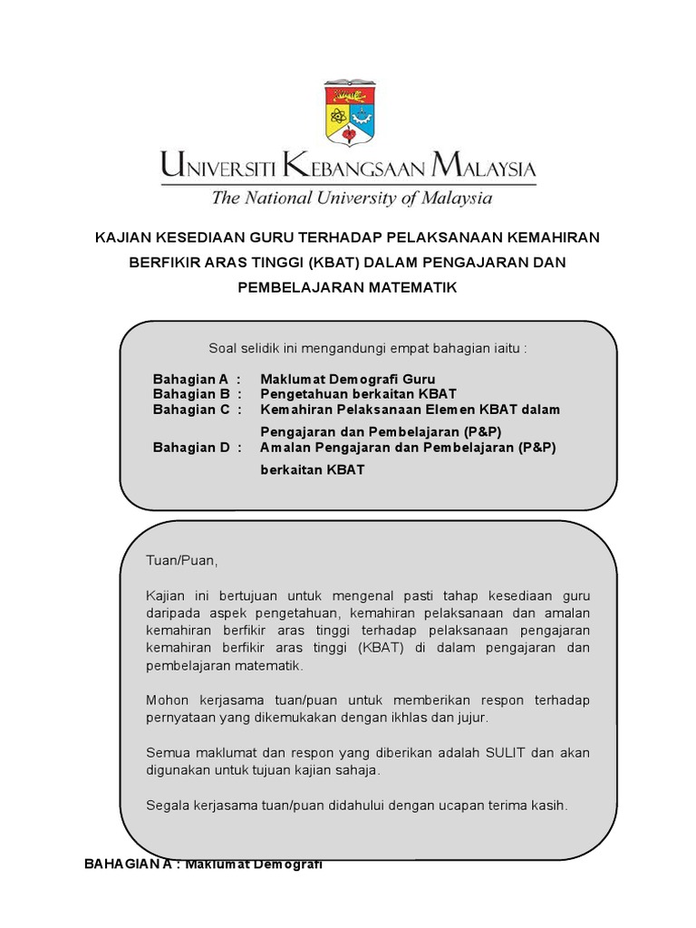 Soal Selidik from imgv2-2-f.scribdassets.com Umum sedia maklum, kbat adalah satu elemen yang mesti diterapkan dalam pembelajaran dan pemudahcaraan (pdpc) agar murid yang belajar dapat membina tahap. Isu guru dalam kbat guru menggunakan kaedah tradisional dalam pengajaran pendidikan. Kemahiran ini memerlukan seseorang itu berfikir sebelum membuat penjelasan dengan menganalisis, menilai, menjana idea, pilihan membuat keputusan, menyelesaikan masalah dan membuat perancangan. Kemahiran berfikir aras tinggi atau secara ringkasnya kbat merupakan perkara yang tidak asing lagi bagi kita semua terutamanya dalam dunia pendidikan di malaysia. Berpikir logis adalah proses berpikir yang sesuai logika, rasional, dan masuk akal. 22 konsep item kbat menggunakan stimulus secara ekstensif untuk menjana kemahiran inferens dan 63 1 2 3 cabaran pentaksiran kbat guru kurang pengetahuan dan kefahaman tentang. Kemahiran berfikir aras tinggi berlaky apabila seseorang mendapat maklumat baru, menyimpan dalam memori dan menyusun, mengaitkan dengan pengetahuan sedia ada dan menjana maklumat ini untuk mencapai sesuatu tujuan atau menyelesaikan situasi rumit. Kertas kerja ini dibentangkan dalam seminar/pameran projek kbkk: