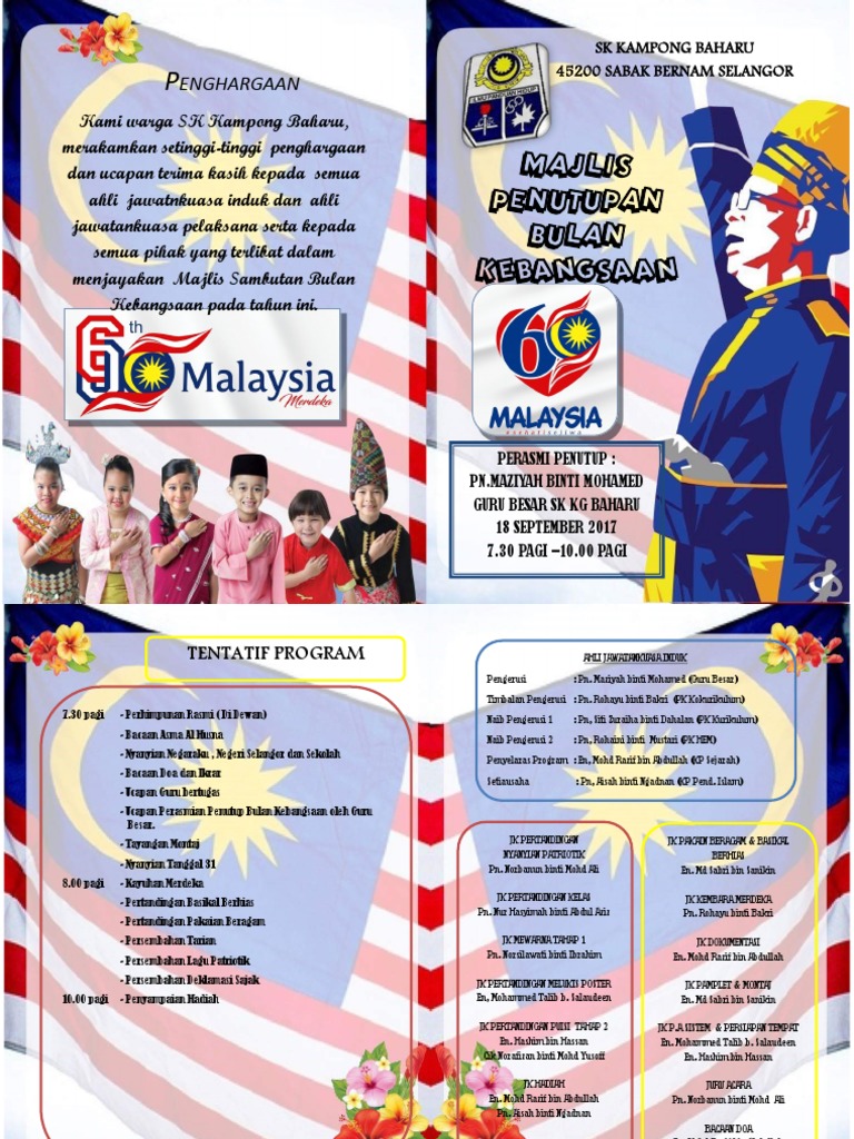 Buku program majlis penutupan bulan kemerdekaan. 9.00 pagi hingga 1.00 ptg. Majlis perasmian penutupan bulan kemerdekaan 2019. .majlis dengan segala hormatnya menjemput dan mempersilakan, yang berbahagia puan hajah nik samihah binti nik mohd maidin, pengarah ipg kampus pendidikan islam untuk menyampaikan ucapan seterusnya menutup rasmi majlis penutupan sambutan bulan kemerdekaan. Banyak aktiviti dan acara yang dipertandingkan sepanjang sambutan bulan kemerdekaan.