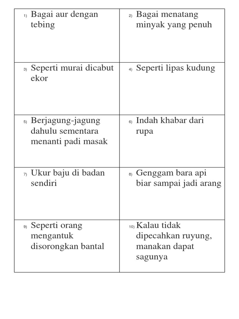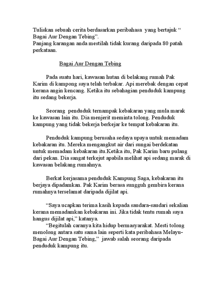 Learn vocabulary, terms and more with flashcards, games and other study tools. Farah dengan hana bagai aur dengan tebing kerana salaing membantu. Ia juga adalah gambaran kepada. Bagai aur dengan tebing maksud : Hati gajah sama dilapah, hati kuman sama dicecah 5. Berat sama dipikul, ringan sama dijinjing 6. Posted by unknown at 01:04. Peribahasa ini menunjukkan tentang keakraban dan muafakat dalam masyarakat antara sahabat. Ketua kampung selalu berpesan mengamalkan sikap bagai aur dengan tebing antara penduduk kampung supaya kehidupan sejahtera bersama. Baik proverb, yanyu, kotozawa dan peribahasa memiliki kesamaan yaitu susunan kata yang digunakan selalu sama. Peribahasa bagai air dan tebing itu diartikan sebagai suatu ikatan yang kokoh dimana dalam hubungan tersebut melibatkan tolong menolong, tunjang menunjang, saling menopang satu sama lain dan sebagainya. Situasi dimana seseorang berada dalam kondisi berbahaya atau genting. Temukan lagu terbaru favoritmu hanya di lagu 123 stafaband planetlagu.